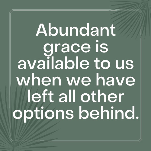 Grace comes, reliably and miraculously, and enters every fear-filled place “in due proportion to the necessity” at just the right time. It is everything you need for that moment. Abundant grace…available to us when we have left all other options behind.