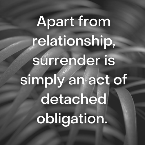 Our proper response to grace should always take the form of surrender. Since grace (which is the activity of the Holy Spirit) is inherently and insistently relational, our surrender is never to mere constructs of rules and morality. The capacity to surrender to God’s purposes and ways arises out of a growing friendship with God. We surrender to a person. Our ability to surrender will always be grounded in our personal reality of God’s life-giving and redemptive activity and movements in our lives. Apart from relationship, surrender is simply an act of detached obligation. In response to relationship, however, surrender becomes an act of trust and devotion. In this way, giving ourselves over to the unction of grace becomes the essence of our true and proper worship.